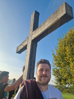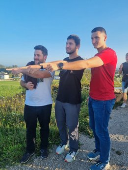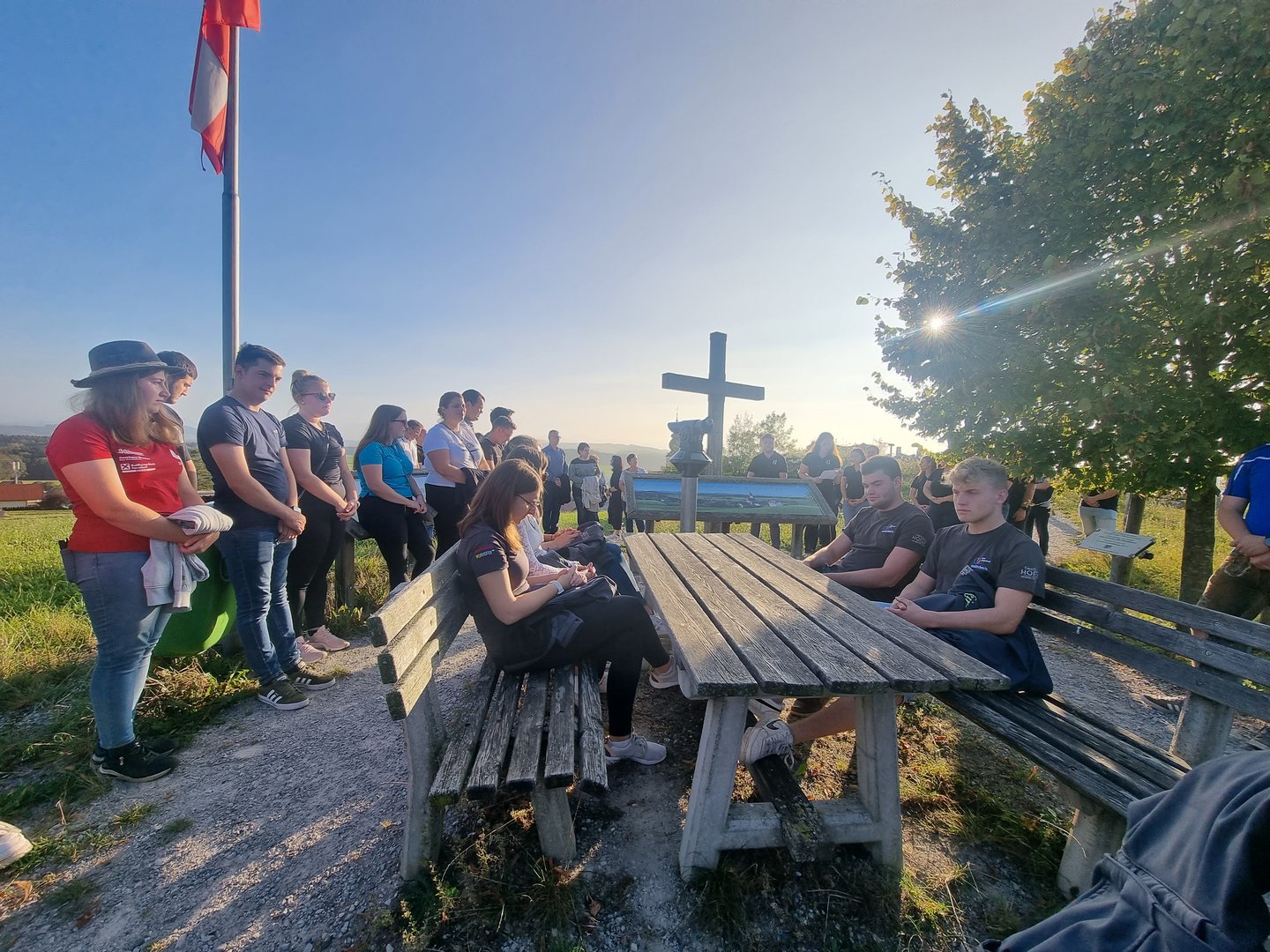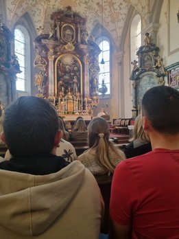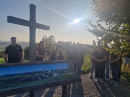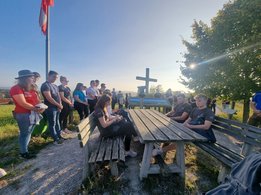Nach einem kurzen Marsch auf einen Hügel hörten die Teilnehmerinnen und Teilnehmer ein Gedicht von der Leiterin der austragenden Landjugend. Auch ein paar Informationen über den Ort bekam die Gruppe zu hören. Das Kreuz oben auf dem Hügel hat die Landjugend Kirchberg vor einigen Jahren aus einem Baum, in dem der Blitz eingeschlagen hat, gefertigt und als Gipfelkreuz auf dem Hügel aufgestellt. Nach der kurzen besinnlichen Zeit und nach einigen gelungenen Fotos mit den letzten Sonnenstrahlen des Tages, erwartete die Wortgottesdienstleiterin die Landjugendlichen in der Kirche. Umrahmt mit schönen Querflötenstücken und Gesang gestaltete die Landjugend Kirchberg und die Wortgottesdienstleiterin den Gottesdienst zeitgemäß und passend zum jungen Publikum.